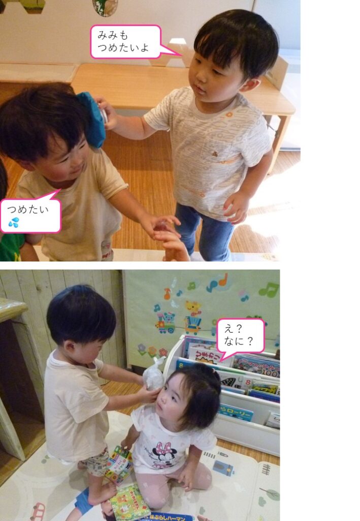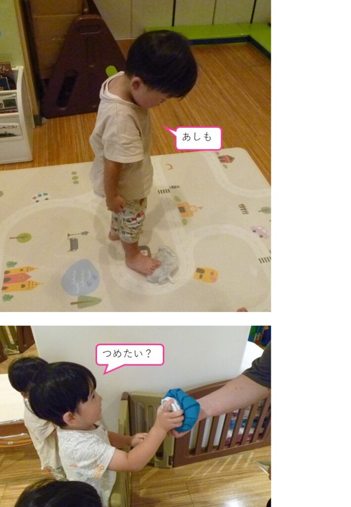 部屋に戻ったきりんぐみ(2歳児クラス)に氷を入れた氷のうとビニール袋を渡してみました。