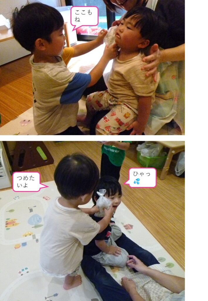 「冷たーい」と言う声が飛び交い、氷を当てる場所をいろいろ変えてその冷たさを感じていました。