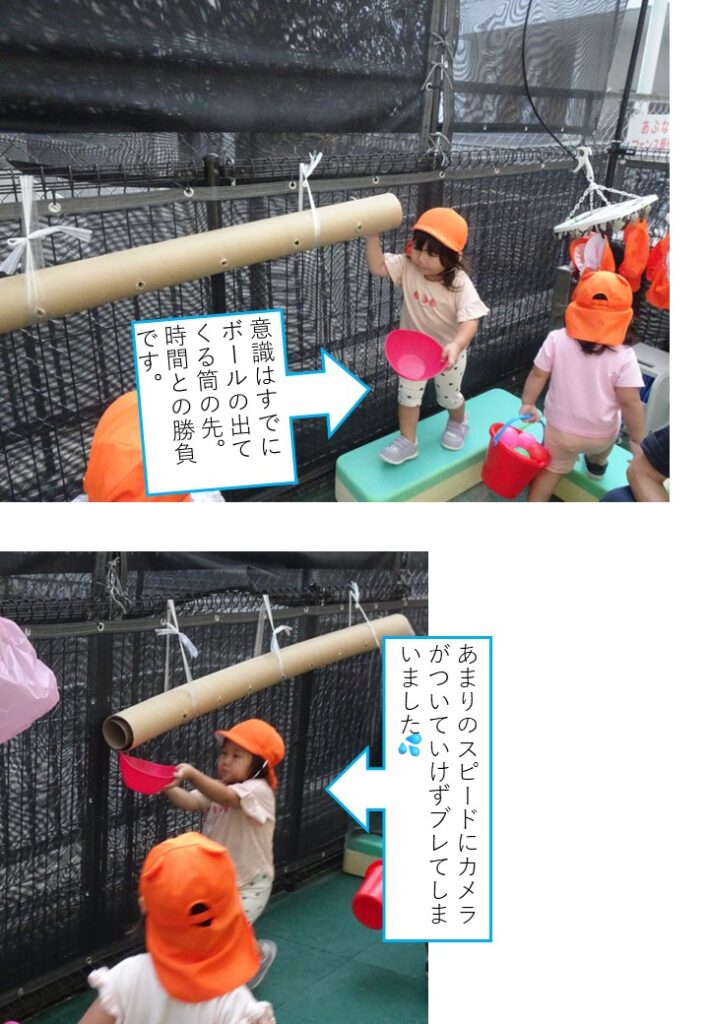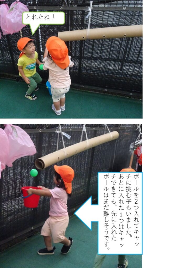 最初は入口でボールを入れる子、それを他の子が出口で待って容器にキャッチするのを楽しんでいました。