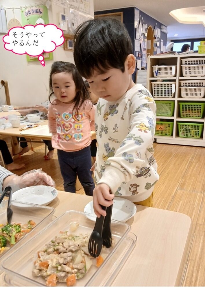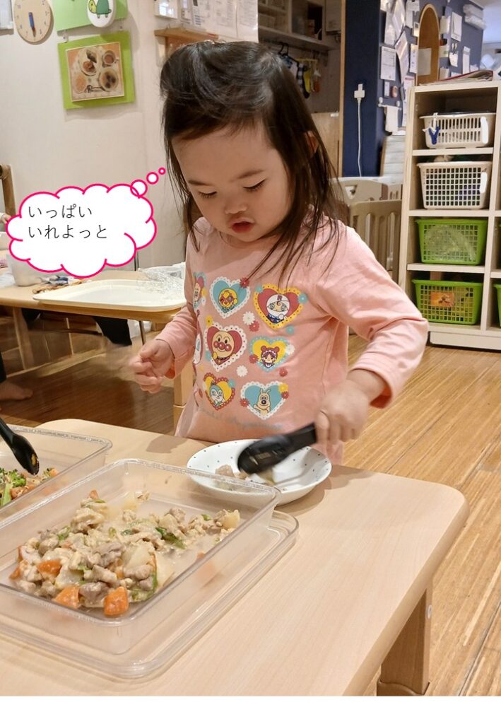 きりんぐみ(2歳児クラス)は自分の食べる量を考えて盛り付けられるようにしています。