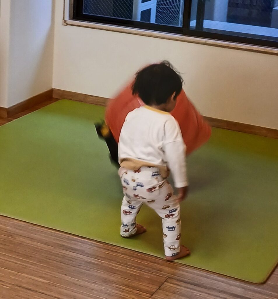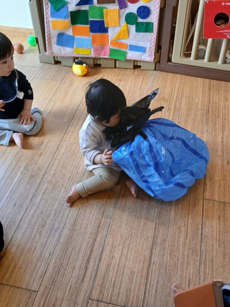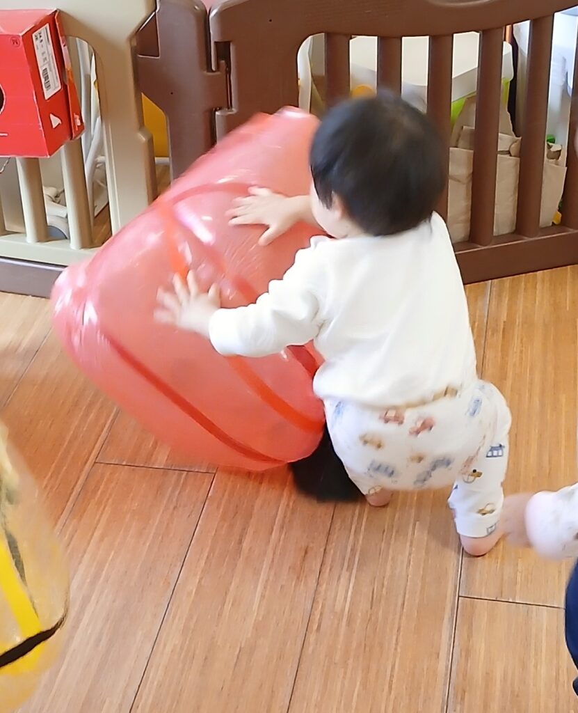 2026.02.03 園日記 おに?(ひよこぐみ) さわってみよう「むぎゅっ」 乗っかってみよう「ボフッ」 持ち上げてみよう「よいしょ」 投げてみよう「とりゃっ!」 かじってみよう「はむはむ」 ひよこぐみ(0歳児クラス)の探求心に鬼もやられて、しぼんでしまいました。