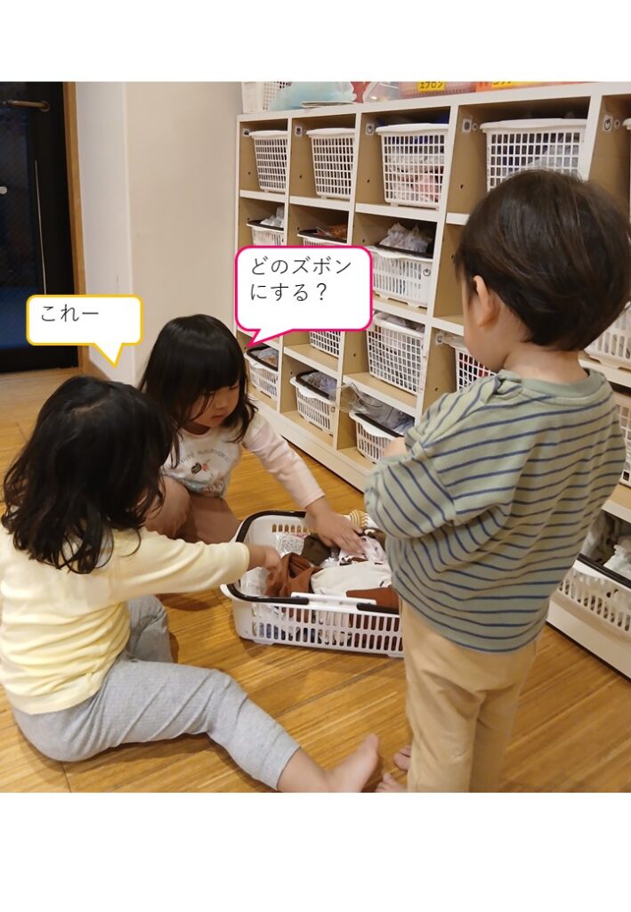 飲んでいるときにこぼしてしまい、「着替えようか?」とその子に声をかけると、すかさずお着替え隊がとんできました。