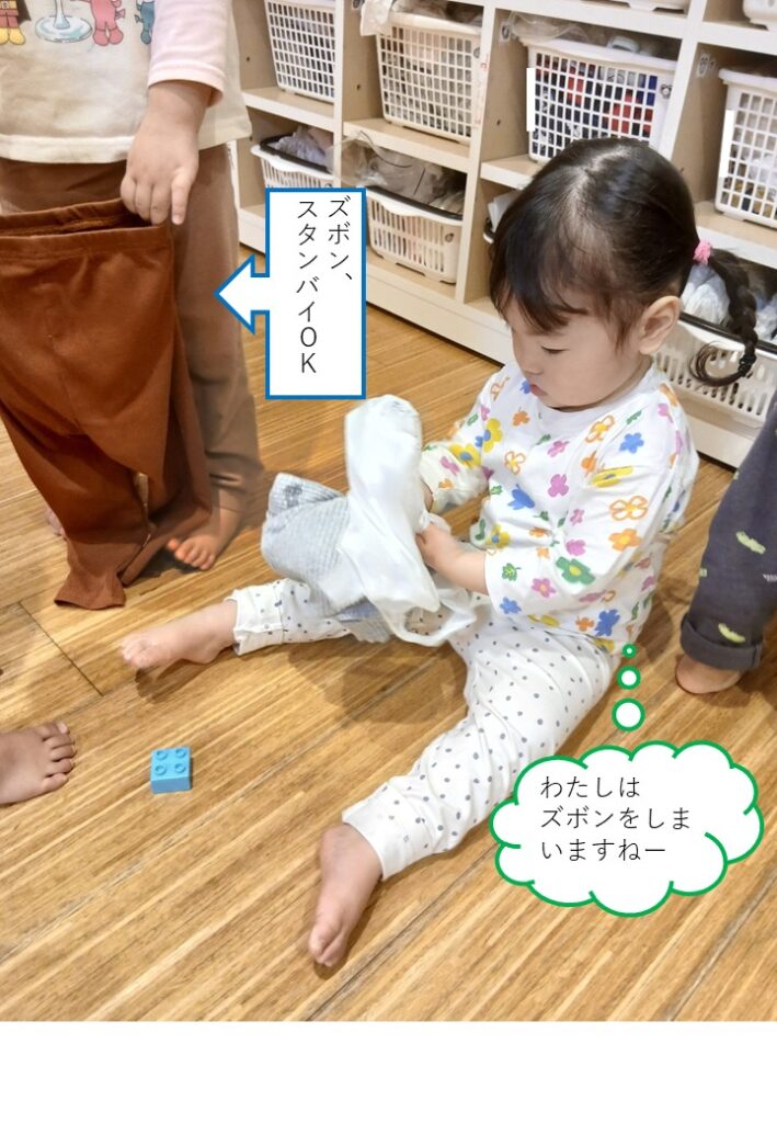 お着替え隊の勢いに身を任せるように、お着替えされている子はズボンを履いて腰まであげてもらっていました。
