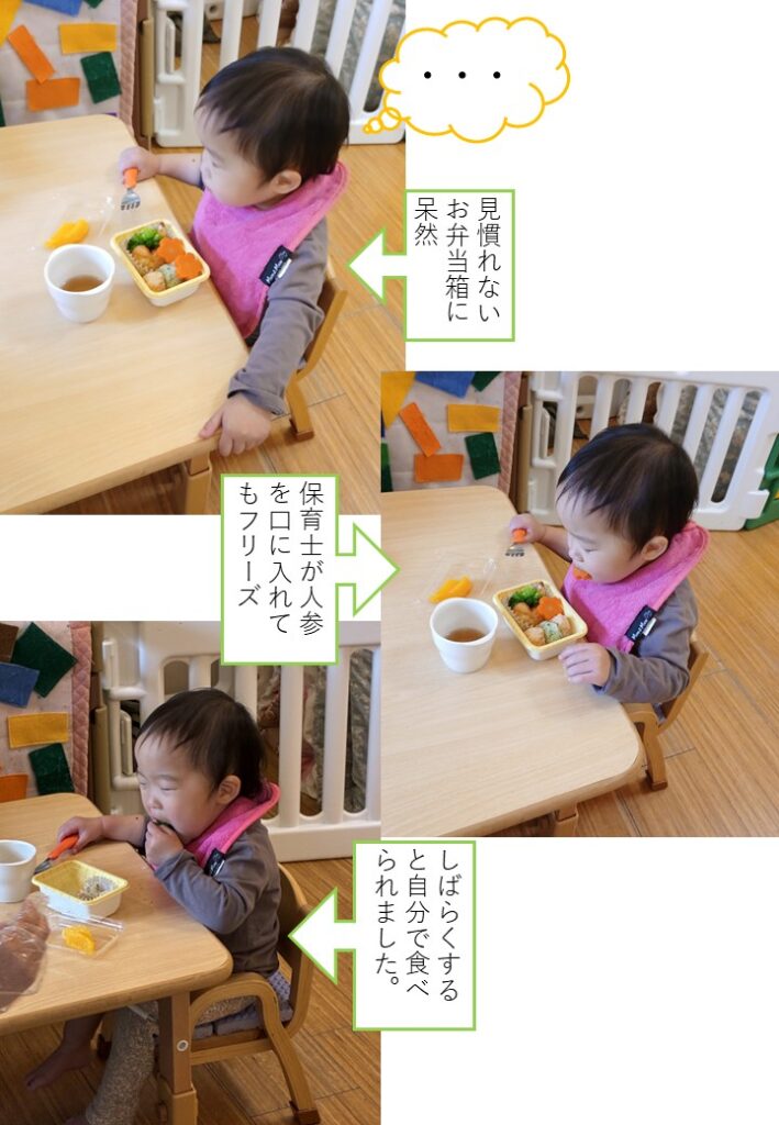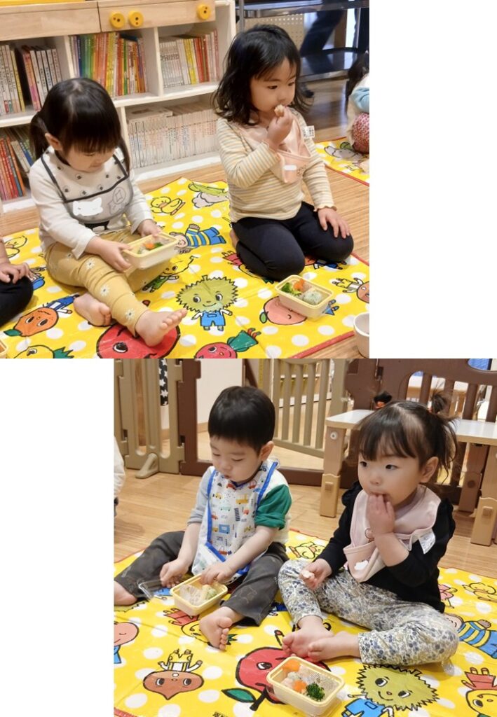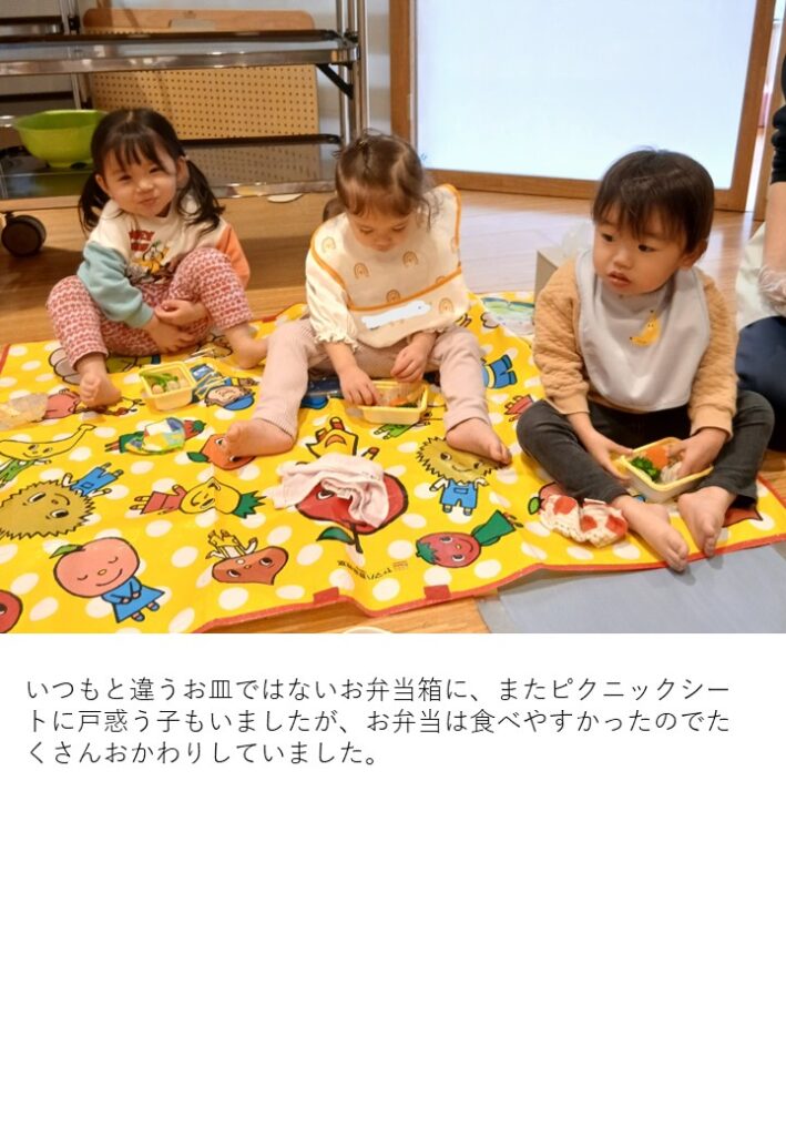 うさぎぐみ(1歳児クラス)、ひよこぐみ(0歳児クラス)は遠足は行きませんが、お弁当給食でした。